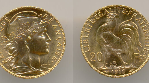 Нумизматика. Золотая монета. Франция, 20 франков 1910 года. Gem Uncirculated.