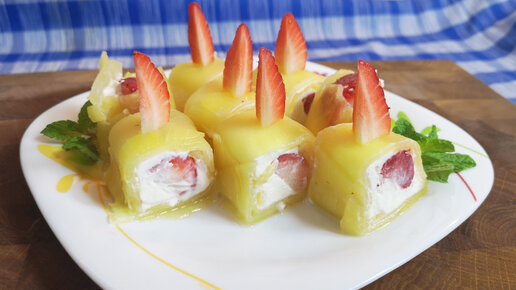 Ролл из ананаса с клубникой и сливочно-творожным сыром для любимой девушки на праздник 8 марта или романтик.