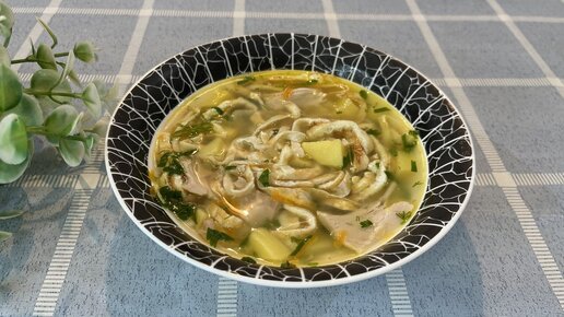 Простой, но очень эффектный куриный суп: добавьте яичный блинчик и наслаждайтесь! Просто, вкусно и сытно