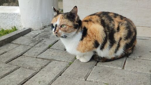 Самая красивая трехцветка смотрит, как другая кошка бегает за котенком
