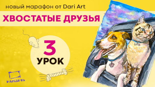 Бесплатный урок по акварельному скетчингу! Рисуем кота и собаку! хвостатые друзья 2 урок
