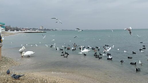 Чайки, люди, лебеди и море