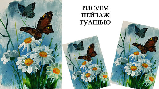Как легко нарисовать бабочку. Рисуем пейзаж гуашью. Как нарисовать ромашки. Рисуем бабочек на цветах.