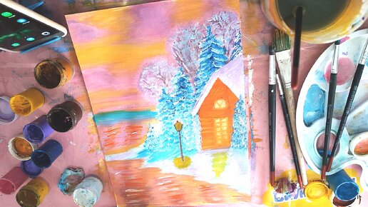 Зимний закат | Дом на берегу | Рисование гуашью. Рисую первый раз.