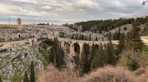 Италия. Живописный каньон с видом на древний мост-акведук и церковь в гроте Мадонна делле Стелле. Гравина Ин Пулья