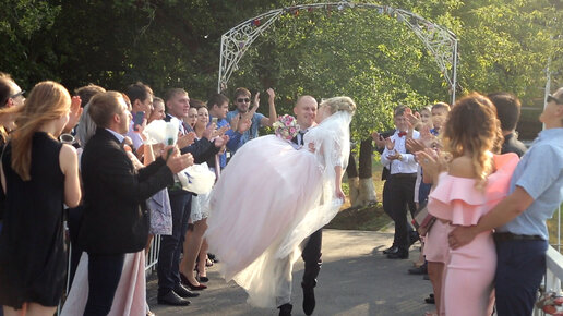 Жених, невеста, свидетели и друзья на прогулке в парке