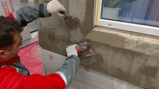 Установка диагональных косынок из Фасадной Стеклотканевой Сетки на углах оконных проёмов, Bautex Krepix 2000 втапливаем в клей для СФТК