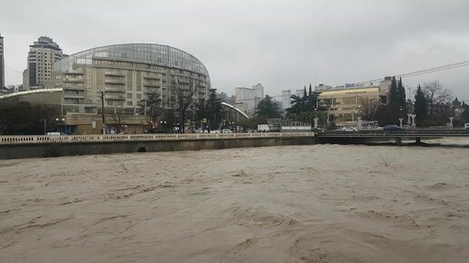 Вода сильно поднялась. Бурные потоки реки Сочи несутся к морю. Вот такой вот февраль.