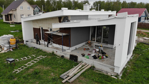Красивый дом с плоской кровлей, со сложными и красивыми фасадами, декоративная штукатурка под Дерево, утепление фасадов пенопластом ППС16ф