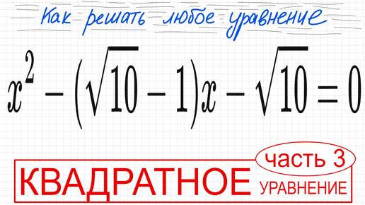 №7 Квадратное уравнение с корнем x^2-(√10-1)х-√10=0 Что делать с квадратным корнем в уравнении Как решить уравнение 8к 9кл ОГЭ 10кл 11кл ЕГЭ