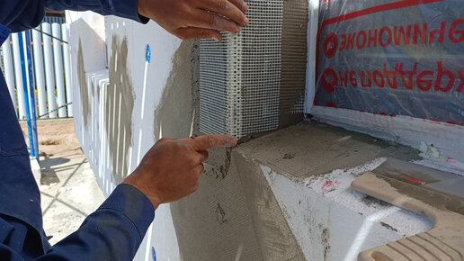 СФТК Мокрый Фасад, установка уголка с сеткой на оконный откос, уголок втапливается в клей, из перфорации вылезают червячки клея, база
