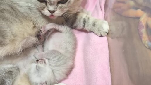 Мама кошка моет своего спящего котенка