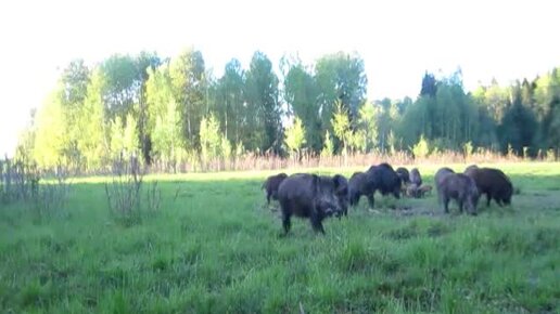 Стадо кабанов кормится на лесной поляне и увидев опасность спасаются бегством.