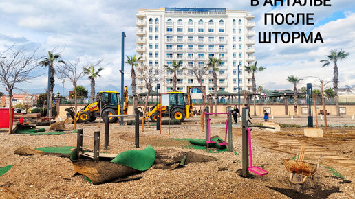Набережная Кониалты после шторма, городские службы наводят порядок, Анталия