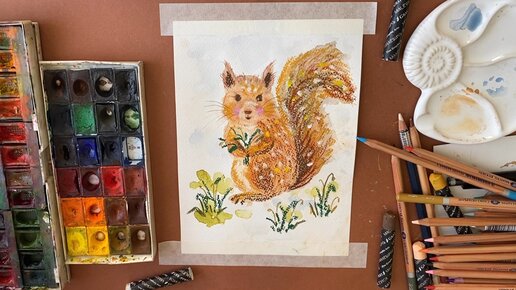 Белочка с букетом подснежников. Пастель и акварель #маслянаяпастель #пастельдляначинающих #рисунокпоэтапно