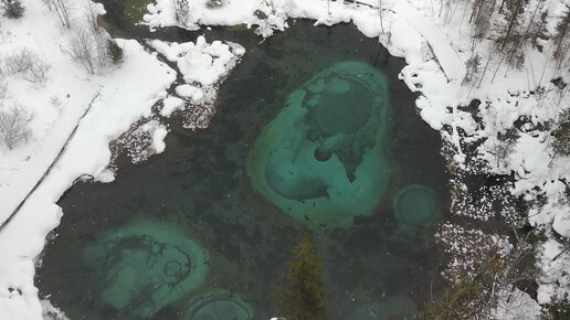 Алтай, Акташ. Ледопад Кошкин Бом и Гейзерное голубое озеро зимой.