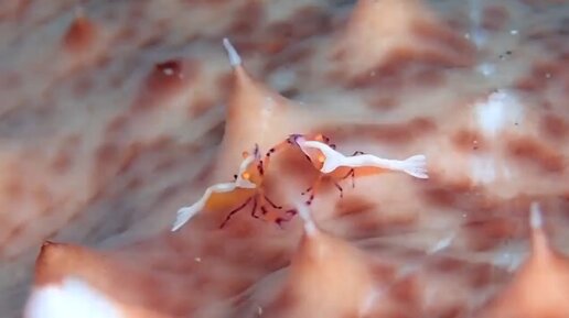 Две креветки устроили эпичный файт, используя спину морского огурца, как арену. Чем все закончилось, как думаете?🦐@Минутка из Океана