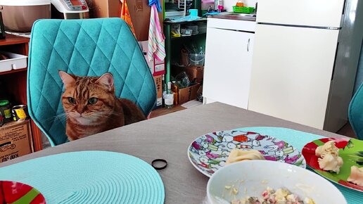 Обедаем, кот пришёл составить компанию и начал хулиганить.