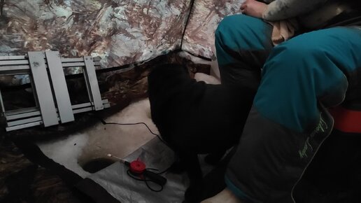 Ловим живца в палатке. за бортом -42. Опарыш бегает по палатке, не успеваем ловить, а вот мопс бдит снасти и поклевки.Рыбак...