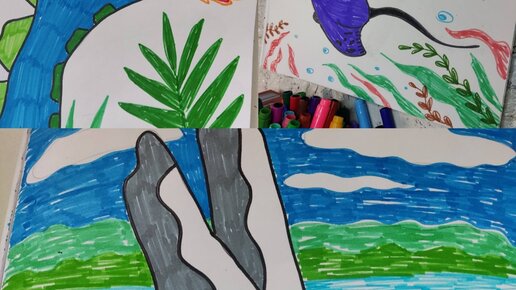3 в 1 Обводим руку рисуем Динозаврика, Чайку и морского Ската