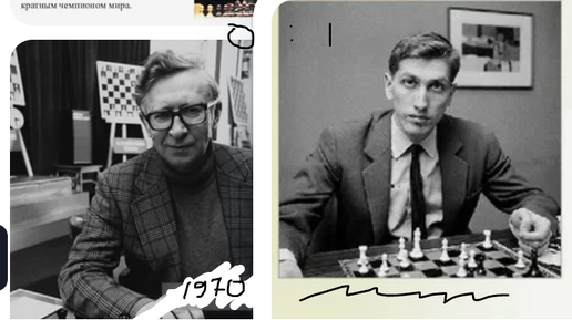 Роберт Фишер идет черными к простой, мощной победе в "Нео-Грюнфельде", а Василий Смыслов понимает, что дальше играть бесполезно на 46х, 1970