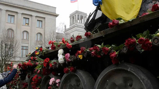 Возложение цветов к уничтоженному российскому танку в Берлине.