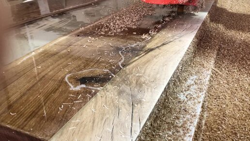 Фрезеровка дубовой столешницы на ЧПУ после заливки эпоксидной смолой.