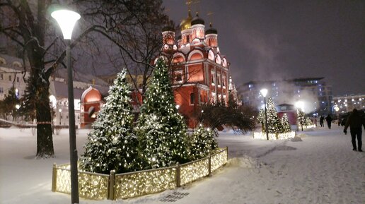 Огромные старинные красивые храмы в парке Зарядье. Ёлочки, как будто семьи, в рядом вдоль дороги стоят