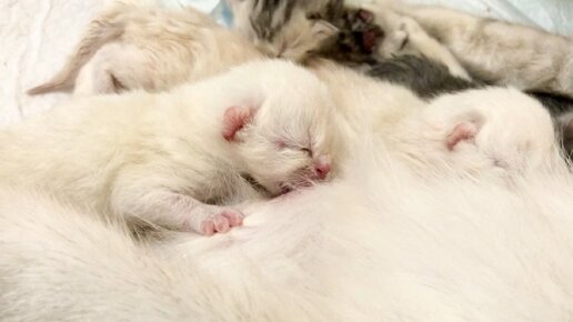 Новорожденные котята кошки Кайли активно сосут молочко сразу после рождения.