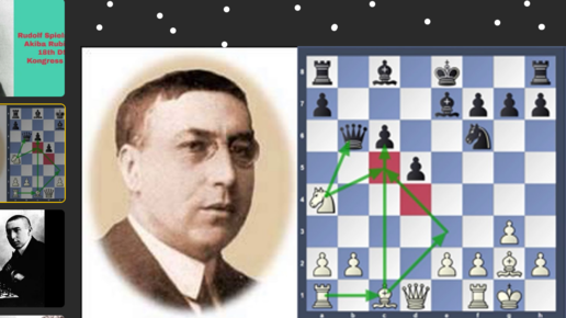 "Сжигая лондонскую систему" Акиба Рубинштейн черными красиво выигрывает у Фрэнка Маршалла в Лодзе, 1908 - покажу мат в доигрывании