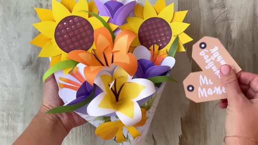 Букет с жёлтыми цветами. Детская поделка на праздник 8 марта или на день рождения. Поделка из бумаги своими руками с шаблонами