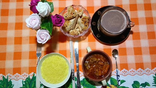 Рис, жаркое, печенье, Кофе с какао и молоком