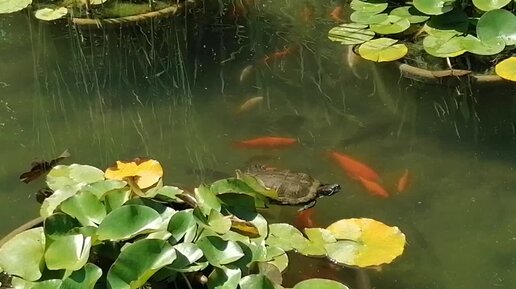 Золотые рыбки и черепашка в одном из прудов Японского сада в Крыму.