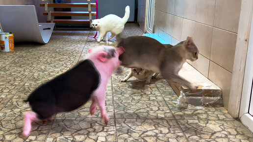 РЕАКЦИЯ РЫСЕЙ И ПУМЫ НА МИНИПИГОВ / Реальная жизнь со свиньей / Минипиг напал на кошку