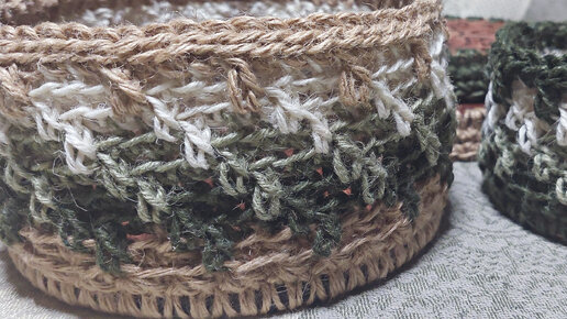 Процесс вязания крючком корзинки из джута, "слёзы апачи"
