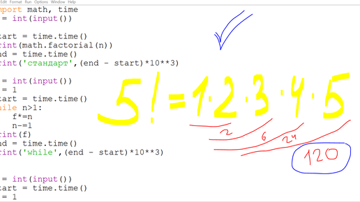 Про факториал программно, в Python. Говорим про логику задач, измеряем время работы в сравнении (циклы for и while, рекурсия, стандарт)