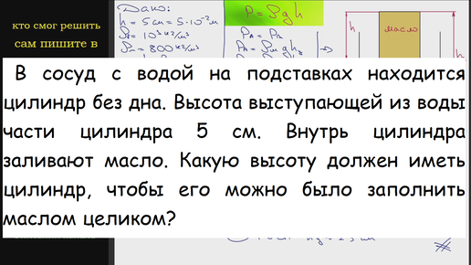 Физика В сосуд с водой на подставках находится цилиндр без дна Высота выступающей из воды части цилиндра 5 см Внутрь цилиндра заливают масло