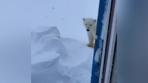 Белый медвежонок вышел к жителям российского поселка
