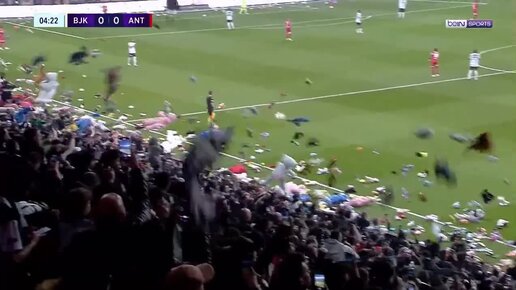 Тысячи мягких игрушек на футбольном поле.