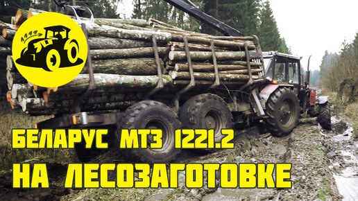Беларус МТЗ 1221.2 с полноприводным прицепом вывозит брёвна по раскисшей лесной дороге.