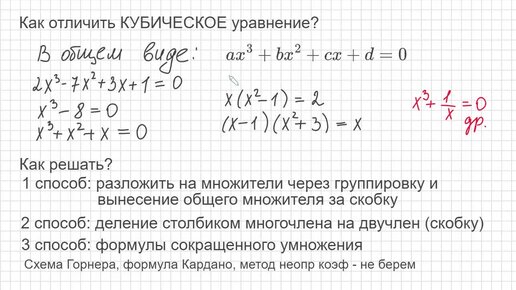 Как решать кубические уравнения Разложить на множители Группировка Деление столбиком многочленов Теорема Безу Формулы сокращенного умножения