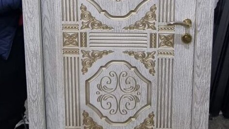 Входная белая металлическая дверь с патиной золото. Дверь выполнена в классическом стиле по индивидуальному дизайну.