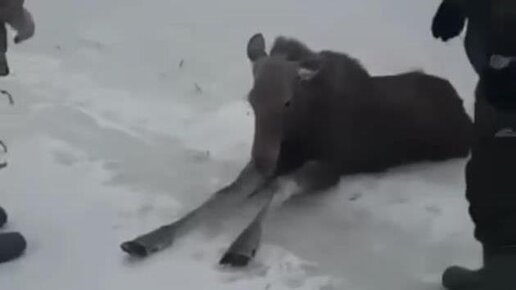 Молодая лосиха упала на льду и не может идти, люди помогли и спасли !