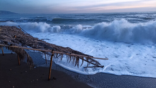 Абхазия, день 26. Море, шум волн, борьба бамбукового навеса с волнами.
