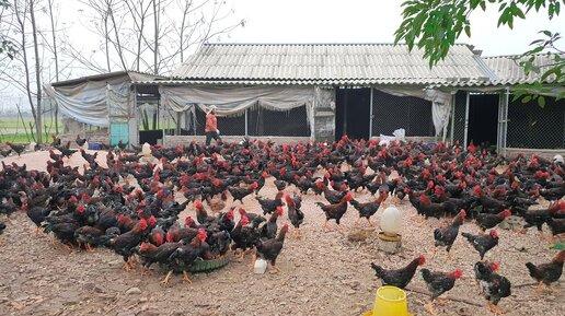 Трудолюбивый фермер и петух Куры на птицефабрике