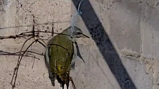 Редкая птица. Видели такую? В нашу деревню залетел зелёный дятел)