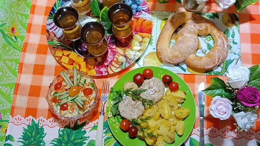 Обжаренный картофель, котлеты, сахарный крендель на десерт