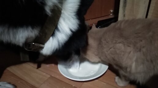 Кот и собака одновременно пьют молоко с одной тарелки))