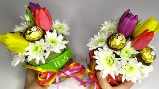 💐Как сделать букет из цветов, чая и сладостей ✔Подарок своими руками ✔Бесплатный мастер класс