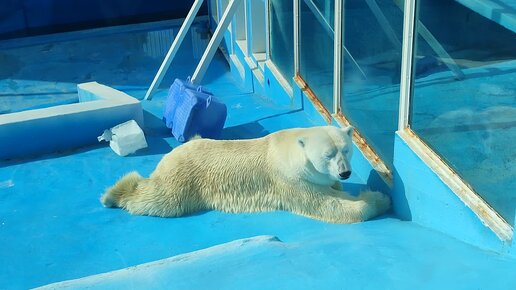 Белый мишка спит на ярком весеннем солнце